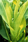 of maize chlorotic dwarf on a young corn leaf (R); healthy leaf (L).